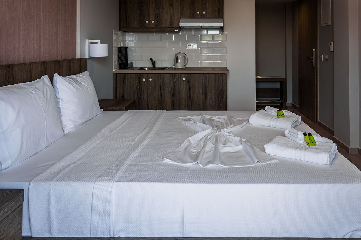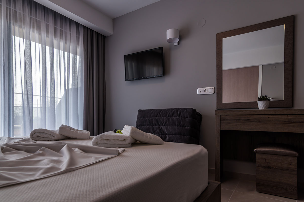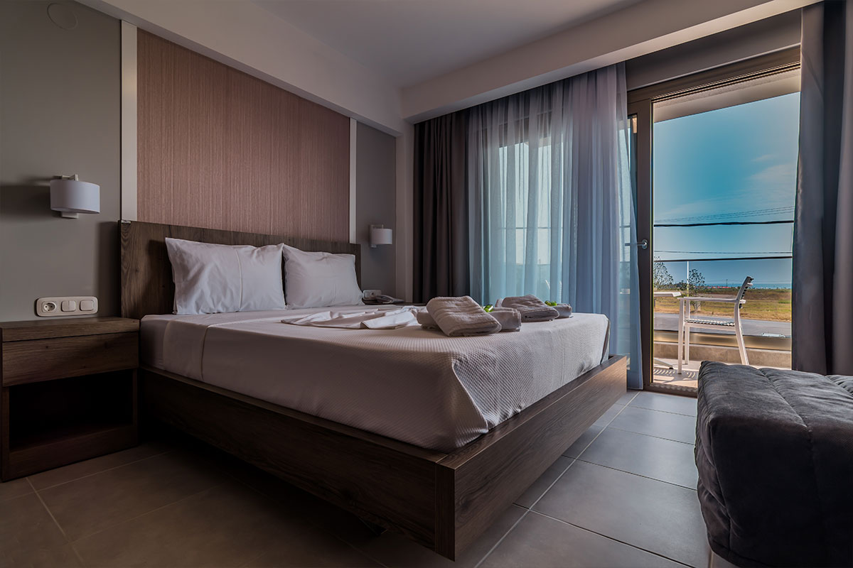 Ευρύχωρα (20-22m2), μοντέρνα διακοσμημένα, με άνετο στρώμα, τα Δίκλινα Δωμάτια μας παρέχουν άνετη διαμονή σε 2 ενήλικες. Κάθε ένα διαθέτει μπάνιο με ντους, δωρεάν προϊόντα περιποίησης και έχει μεγάλο μπαλκόνι με εκπληκτική θέα προς τη θάλασσα ή την πισίνα. Επιπλέον στο δωμάτιο υπάρχει κομοδίνο, τραπεζάκι, ντουλάπα, κλιματισμός, δορυφορική τηλεόραση, χρηματοκιβώτιο, τηλέφωνο, ψυγείο και δωρεάν πρόσβαση στο διαδίκτυο.